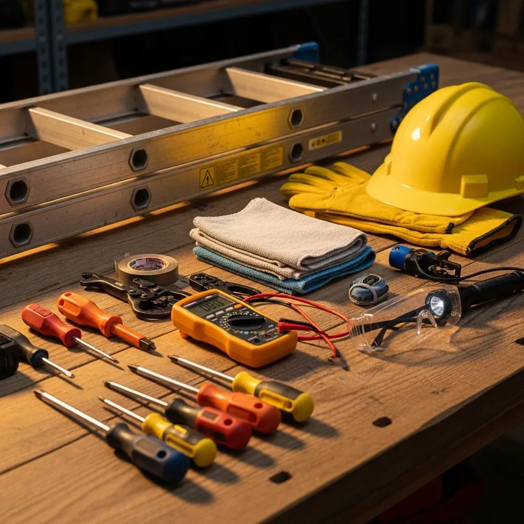 Essential tools for outdoor lighting maintenance including a ladder, screwdrivers, and safety gear