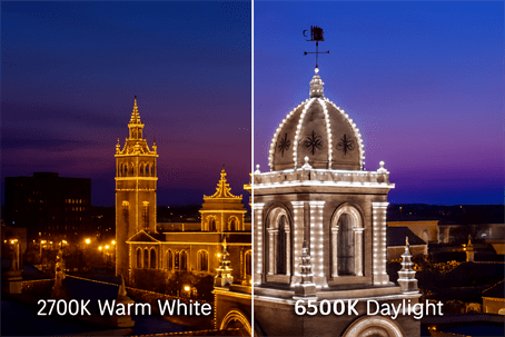 - Left side 2700K: brick looks deeper, limestone golden, landscaping velvety.
